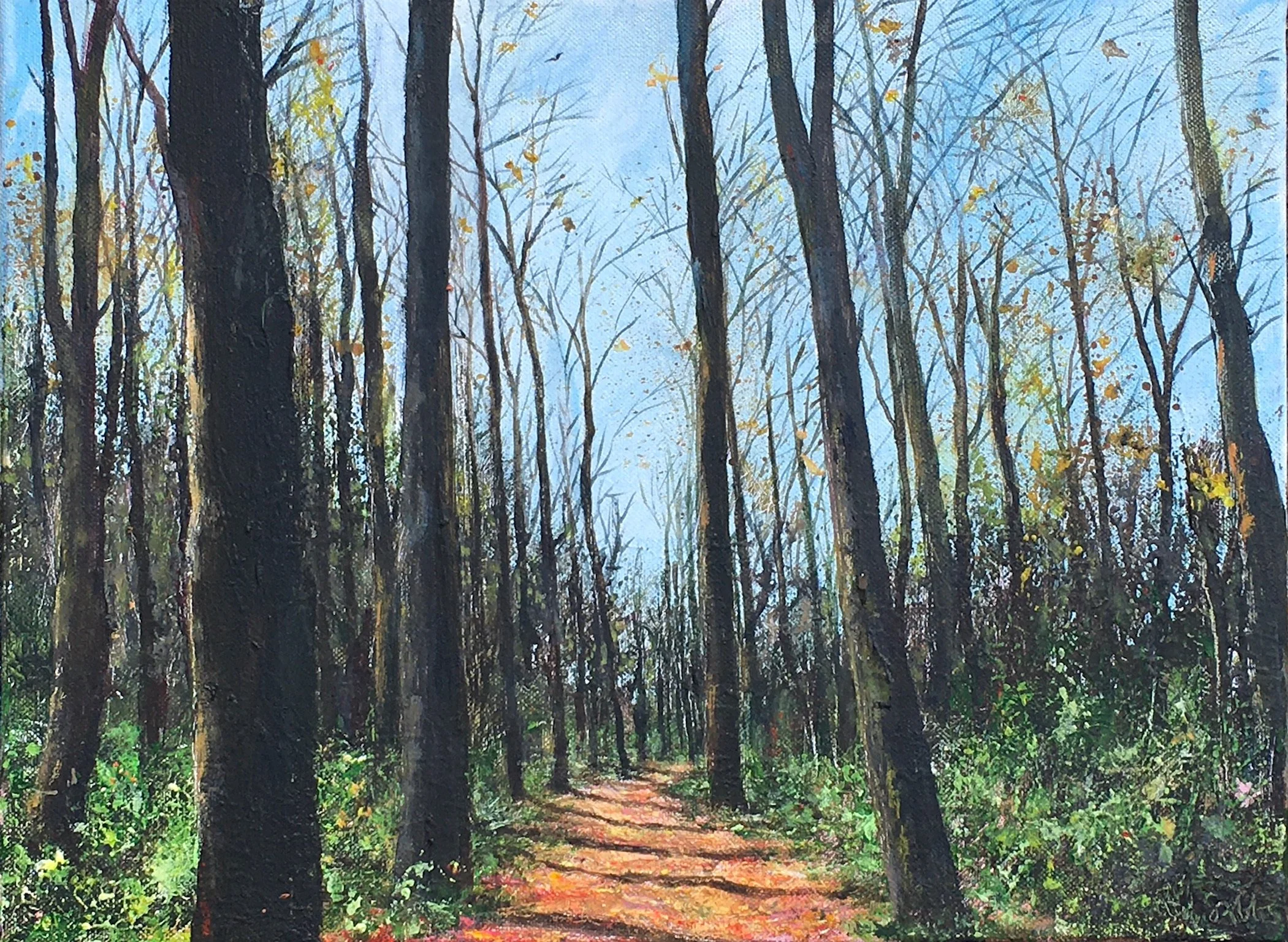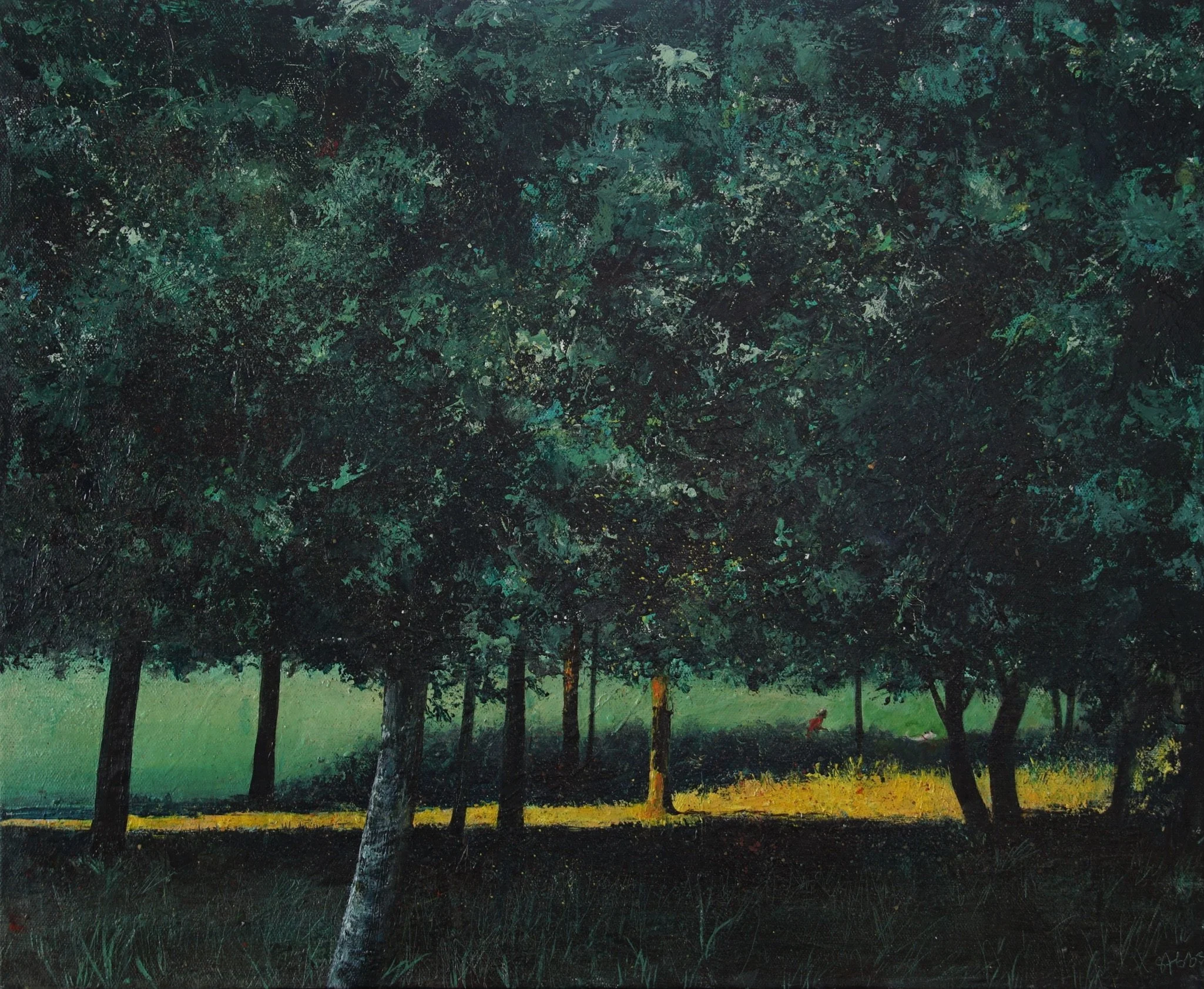 I really want to react to the pandemic and how it has affected us, but in a positive way. During the pandemic, we saw more people than wildlife in the woods and parks - families out for walks as part of their daily exercise, people training their pandemic puppies, or friends jogging. This is one positive result of the pandemic - it has brought families and friends out, together. As with most of my landscapes, activities within them are not always obvious. I invite my viewers to walk into my paintings to discover a family, a dog walker, rabbits etc.